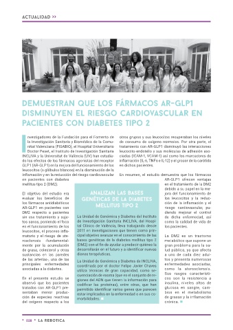 de las arterias-, una de las La Unidad de Genómica y Diabetes de INCLIVA, tos y presenta numerosas principal es generar proyectos de e innovación en los que partici- de uso de antibióticos en el ámbi-