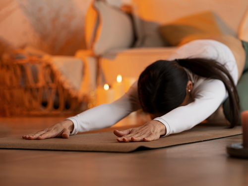 Una rutina de yoga ayuda a aliviar tensiones del día. Con posturas suaves como Balasana, la mariposa reclinada o piernas arriba en la pared, y una respiración lenta, podrás preparar cuerpo y mente para descansar mejor