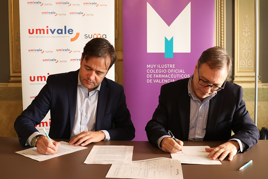 El secretario del MICOF, Vicente Colomer, y el director de zona de UMIVALE, Francisco Reig, han firmado este mediodía en la sede del MICOF un acuerdo de colaboración por el que se establecen las normas que han de regir para la dispensación, facturación y cobro de toda clase de medicamentos y productos sanitarios prescritos con cargo a UMIVALE.