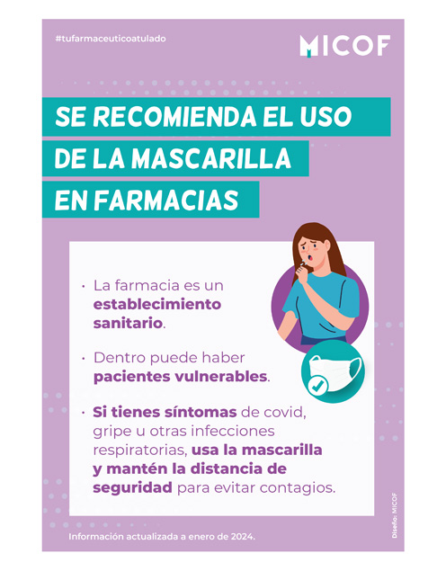 Cartel informativo sobre la recomendación del uso de mascarilla en las oficinas de farmacia y en botiquines si tienes síntomas.