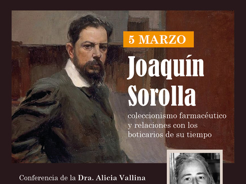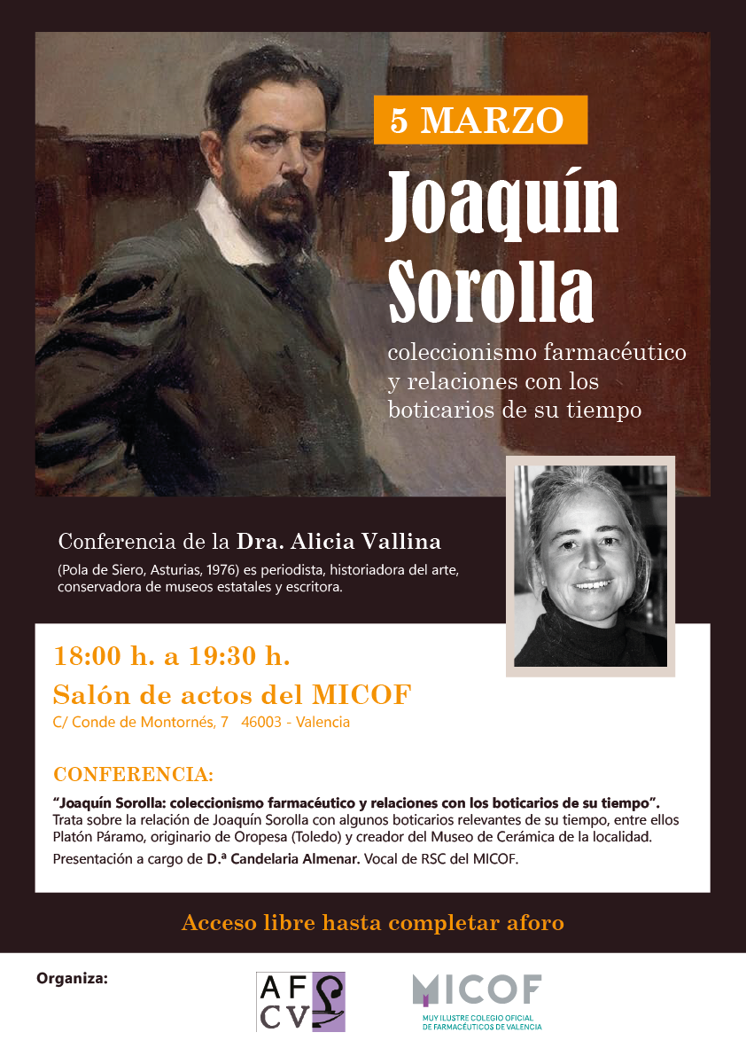 La Academia de Farmacia de la Comunidad Valenciana y el MICOF organizan la conferencia ‘Joaquín Sorolla: coleccionismo farmacéutico y relaciones con los boticarios de su tiempo’ que impartirá la Dra. Alicia Vallina, periodista, historia del arte, conservadora de museos estatales y escritora, el 5 de marzo, de 18 a 19:30 horas, en la sede colegial de Valencia.